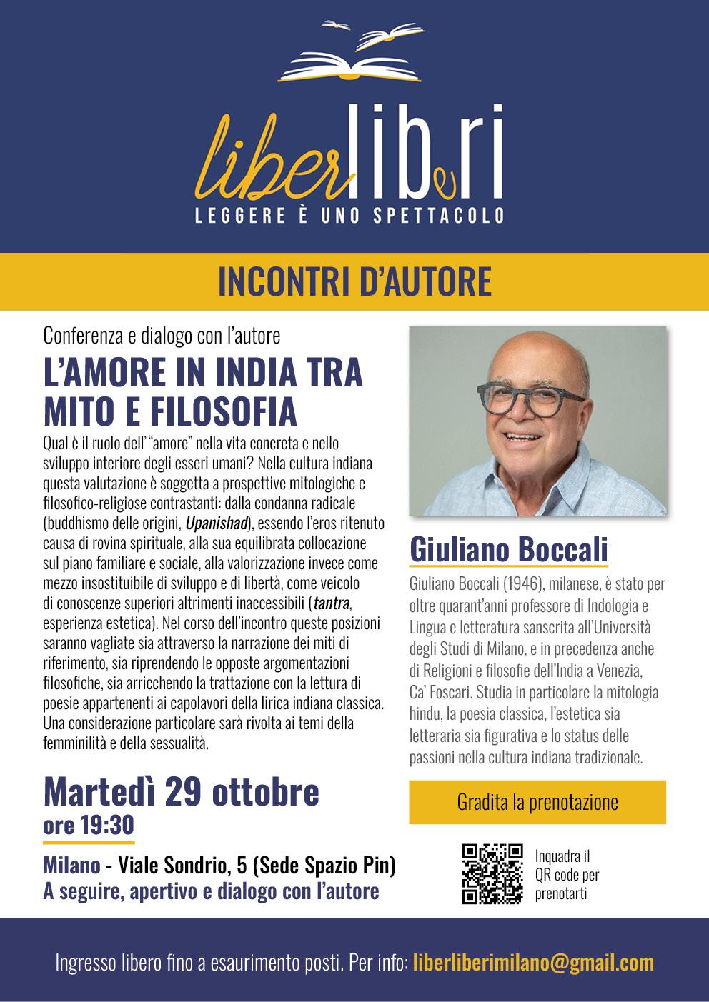 Giuliano Boccali (1946), milanese, è stato per oltre quarant’anni professore di Indologia e Lingua e letteratura sanscrita all’Università degli Studi di Milano, e in precedenza anche di Religioni e filosofie dell’India a Venezia, Ca’ Foscari. Studia in particolare la mitologia hindu, la poesia classica, l’estetica sia letteraria sia figurativa e lo status delle passioni nella cultura indiana tradizionale. Fra le sue pubblicazioni recenti: l’edizione italiana di Kālidāsa, La storia di Śiva e Pārvatī (Kumārasambhava), Marsilio, Venezia 2018, il poema dell’amore e delle nozze dei due grandi dèi; Il dio dalle frecce fiorite. Miti e leggende dell’amore in India, il Mulino, Bologna 2022; Eros, passioni, emozioni nella civiltà dell’India, curato con M. Sacha e R. Torella, Carocci, Roma 2023 (in quest’opera sono suoi i capitoli sulla rappresentazione dei sentimenti nella poesia e nel teatro indiano classico).