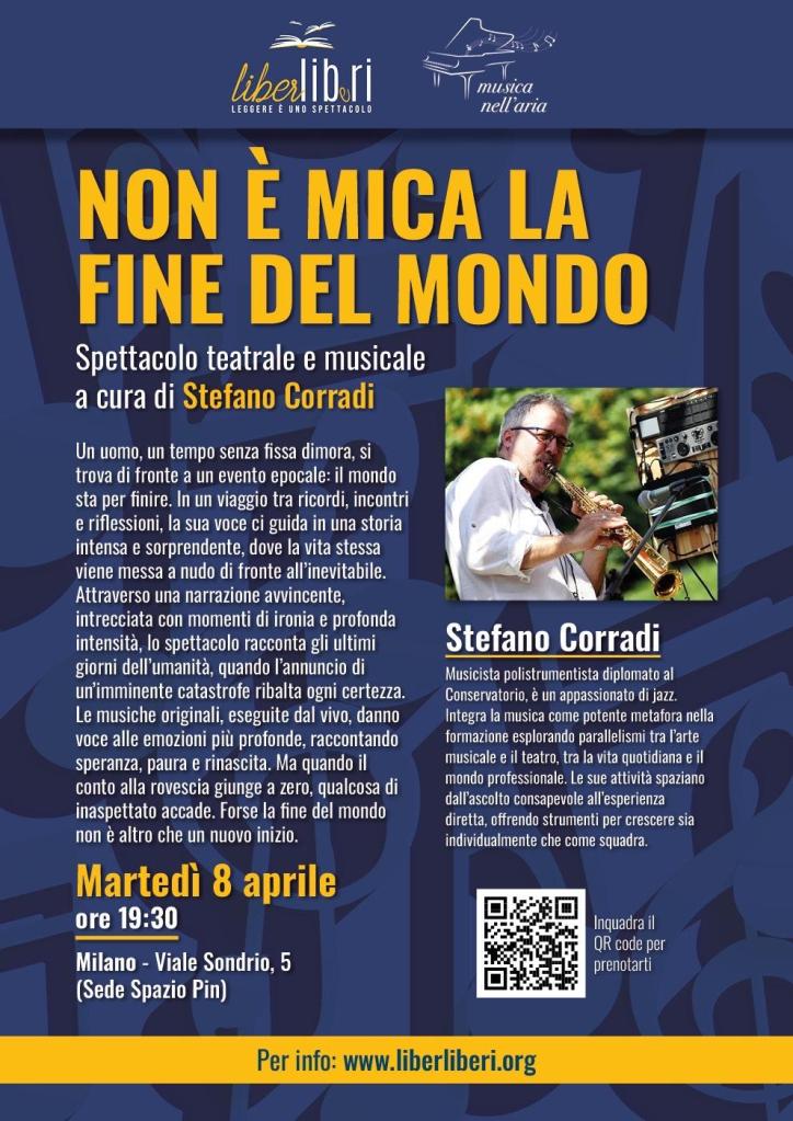 è sempre con grande piacere che il Circolo Vi invita il prossimo martedì 8 aprile alle ore 19:30 a Milano in Viale Sondrio n. 5 allo spettacolo teatrale e musicale “NON E’ MICA LA FINE DEL MONDO” a cura di Stefano Corradi, musicista polistrumentista diplomato al Conservatorio e appassionato di jazz.